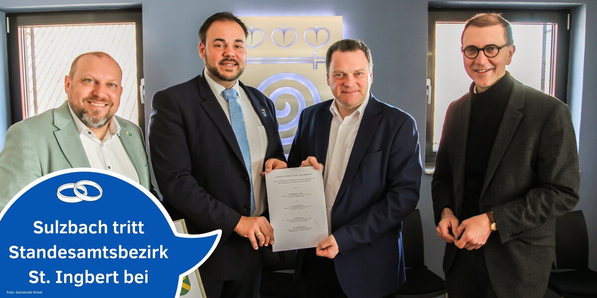 Bürgermeister der Stadt Sulzbach, Michael Adam: „Mit dem Beitritt zum Standesamtsbezirk St. Ingbert stärken wir bewusst die interkommunale Zusammenarbeit in unserer Region. Gerade bei spezialisierten Verwaltungsaufgaben ist es sinnvoll, Kompetenzen zu bündeln und Ressourcen gemeinsam zu nutzen. Für Sulzbach bedeutet diese Kooperation mehr organisatorische Stabilität und zugleich die Möglichkeit, den Bürgerinnen und Bürgern weiterhin einen verlässlichen und wohnortnahen Service anzubieten. Gleichzeitig erweitern sich für Brautpaare auf der Suche nach Traustätten die Möglichkeiten innerhalb des gemeinsamen Verbundes.“